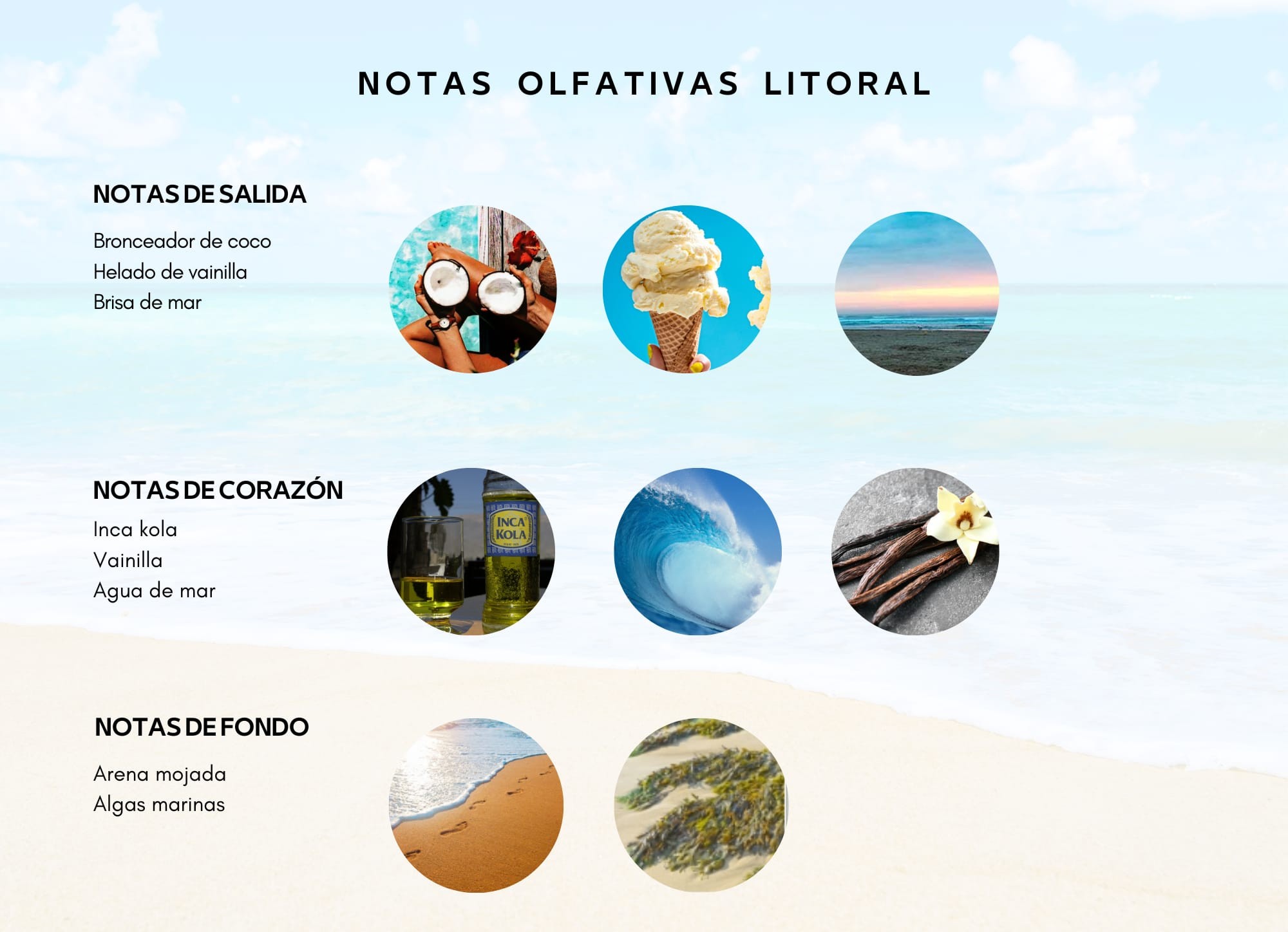 En sus notas de salida se percibe la dulzura del coco y la cremosidad de la vainilla que se entrelaza con la frescura única de la Inca Kola, creando una combinación vibrante que evoca la alegría y recuerdos de tardes dedicadas al disfrute de la playa.